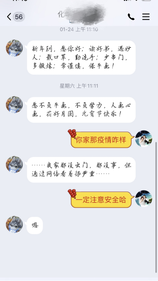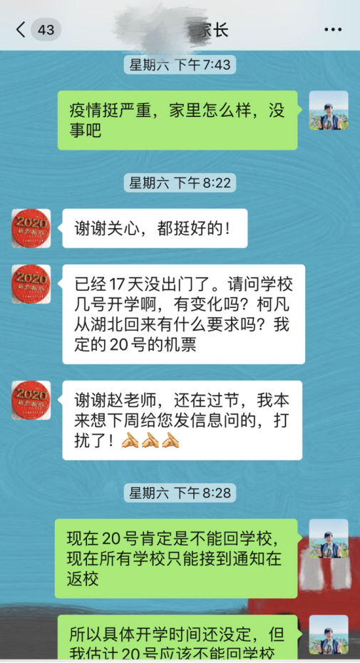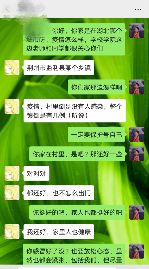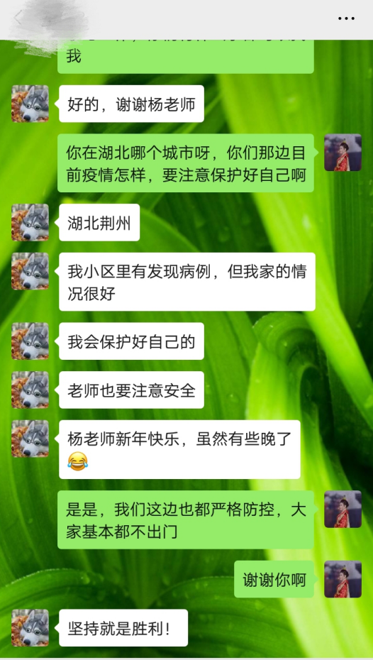 针对湖北的几位同学,老师更是放心不下,不厌其烦地对他们的所处地区,假期路线,接触人群,进行全方位的了解,事无巨细。我们亲爱的张尧老师、赵娜老师、王博老师,更是对同学们时时牵挂,不断地向同学们强调防疫,了解同学们的身体状况,分享给他们防疫方法,嘱咐他们万事小心,这一股股暖流深深钻进了员工们的心里。