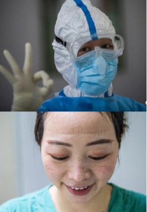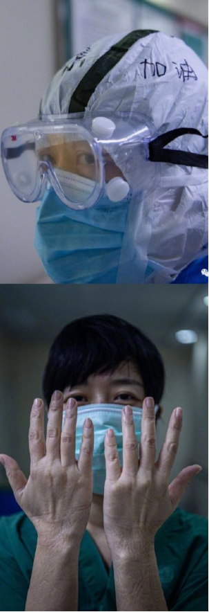 然而就在这个时候,一个个“英雄”奋不顾身地加入了这场没有硝烟的战争,在人们眼中他们无所不能。然而,世界上从来没有什么英雄,不过是一群普通人的默默付出。一线的医护人员们始终秉着“生命重于泰山,疫情就是命令,防控就是责任。”的信念日以继夜的超负荷工作,护目镜和医用口罩下勒出的一道道血痕是他们英勇的勋章,冒着生命危险去拯救病人,医护人员们无怨无悔的奉献着自己,只为病人的平安,武汉的平安,中国的平安。