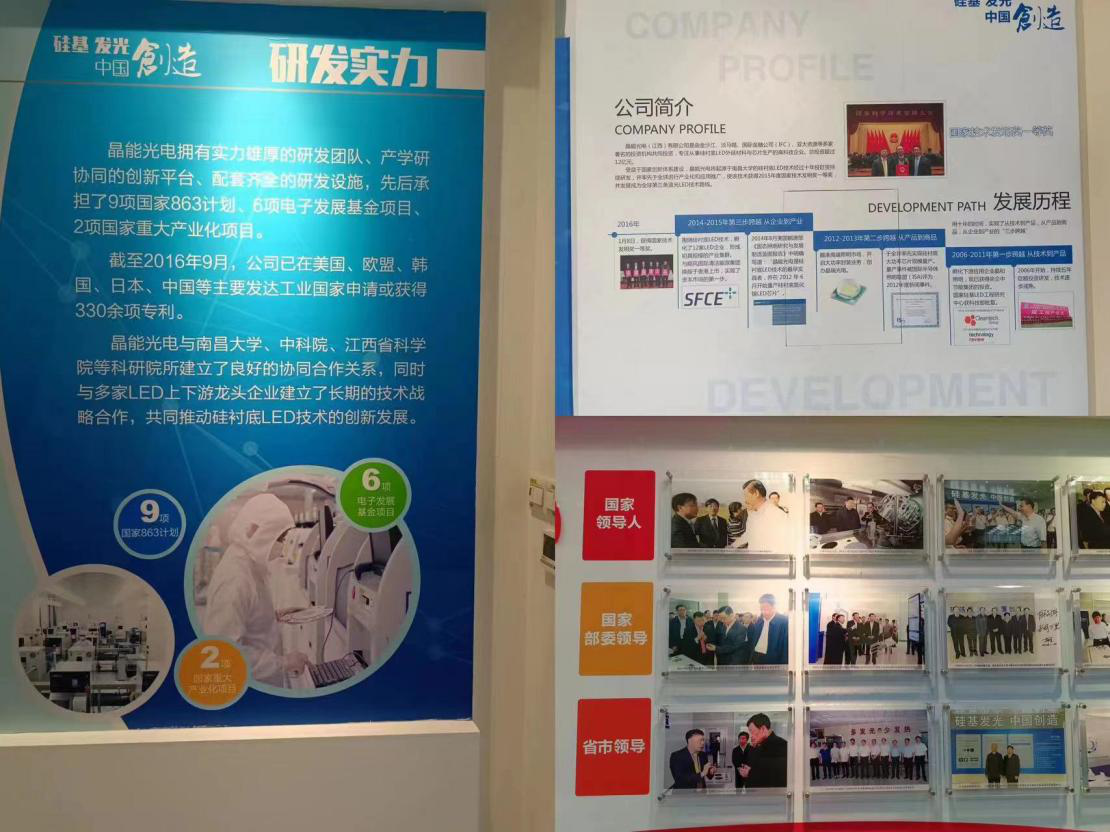 在企业负责人的陪同下,阎峰经理一行到企业中进行参观,晶能光电拥有实力雄厚的研发团队,曾先后承担国家863计划(国家重点研发计划)、电子发展基金项目等9项,省级研发及产业化项目60余项,在全球范围内已申请或拥有480余项专利,自主创新的硅衬底LED技术荣获2015年度国家技术发明一等奖。