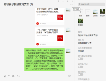 有机化学教研室党支部三名党员,通过“学习强国”平台、支部微信群认真学习、热烈讨论了两会精神。支部同志一致感受到,今年全国两会是在我国疫情防控取得重大战略成果的特殊背景下、在全面建成小康社会进入决战决胜的关键时刻召开的一次十分重要的会议。习近平总书记在会议期间发表了一系列重要讲话,这些重要讲话是习近平新时代中国特色社会主义思想的最新篇章,是全国两会精神最核心、最集中、最重要的内容,充分彰显了习近平总书记质朴深厚的为民情怀,为做好各项工作指明了前进方向、提供了根本遵循。