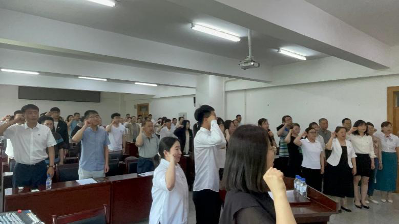 党委书记徐平带领全体党员重温入党誓词。铿锵誓言,心潮澎湃,初心昭昭,砥砺前行。全体党员心灵受到洗礼,理想信念更加坚定。