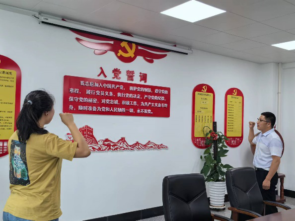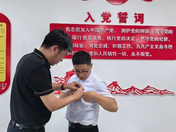 随后,段文龙在支部书记吕美横的带领下重温入党誓词。庄严誓词,声声绕耳,字字入心,时刻提醒全体党员要不忘初心、牢记使命,继续坚定永远跟党走的决心和信心,为共产主义奋斗终身。党委副书记李文泽为段文龙佩戴党章,庄严的党徽戴在胸前,就像一盏指路明灯,给新党员照亮人生方向。