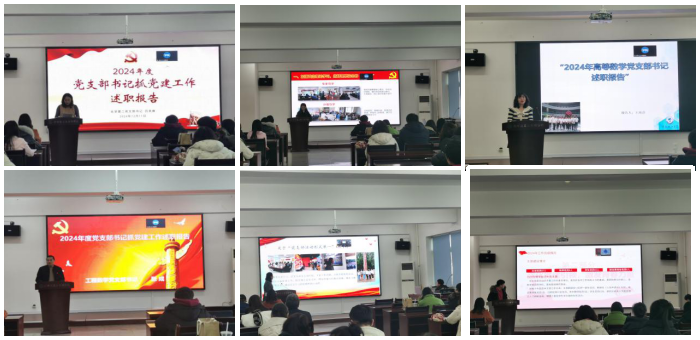 党支部书记吕美横、张晓菲、王欣彦、张成、王春晖、张卓夫分别代表化学第二党支部、化学第一党支部、高等数学党支部、工程数学党支部、物理党支部、员工党支部进行述职。述职内容围绕开展党纪学习教育、增强基层党组织政治功能和组织功能、发挥党员先锋模范作用、落实立德树人根本任务、维护校园安全稳定、以党建引领学院高质量发展、推进全面从严治党等七个方面进行总结汇报,并就上一年党建工作中存在的问题整改情况、今年党建工作存在的问题和改进措施进行分析阐述。